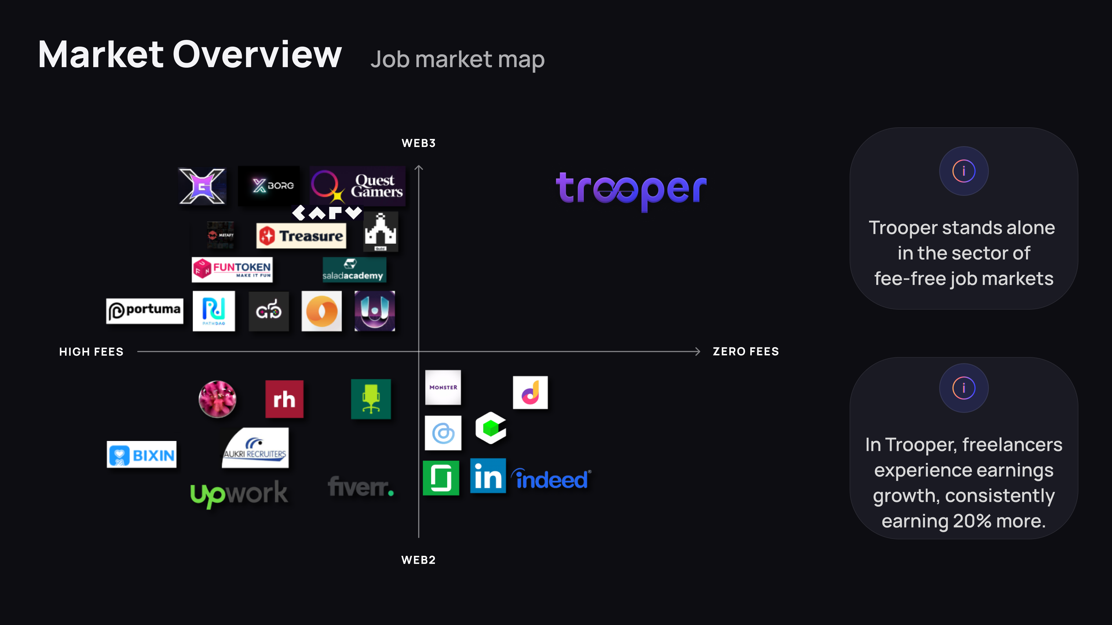 At the top of this map we can see the gaming platforms, at the bottom we have traditional job markets, left is for high commissions, and right for low or free commissions.